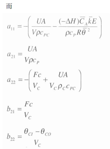 式(4)和(5)是表示反應釜溫度動態(tài)特性的基本方程,均為非線性方程。為了便于應用線性控制理論來分析小擾動下的動特性,對式(4)和(5)進行線性化(在寫增量方程時,為簡化寫法,D一律從簡,各變量上方的“-”表示穩(wěn)態(tài)值),可得以下矩陣形式的線性方程