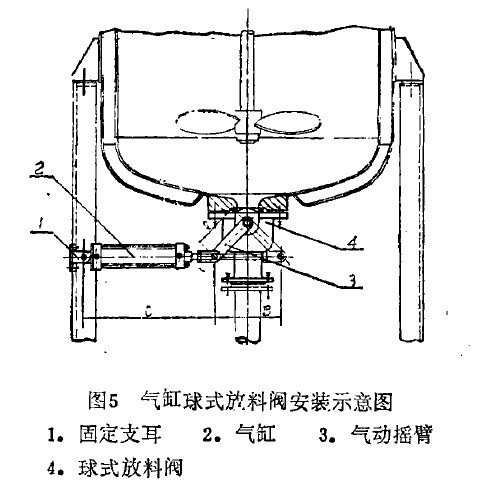 圖5為氣動(dòng)球式放料閥在反應(yīng)釜上的安裝實(shí)例示意圖,圖中表明了氣缸2呈水平狀安裝于球式放料閥的一側(cè),活塞桿與殊式放料閥的氣動(dòng)搖臂3的一端采用絞接方式。氣缸2的固定端則以支耳絞接形式懸掛在固定支耳1上,固定支耳1則可固定安裝在反應(yīng)釜的支腿上或其他穩(wěn)定性好的任何混凝土構(gòu)件上。