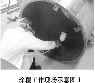 將150L的不銹鋼反應(yīng)釜側(cè)放在水平地面,操作人員鉆進(jìn)反應(yīng)釜,對反應(yīng)釜內(nèi)壁進(jìn)行噴涂。為避免霧氣對人員在操作過程中的傷害,噴涂人員佩戴防毒面具,頭戴防塵帽。并在反應(yīng)釜開口處安裝了工業(yè)風(fēng)扇對霧氣進(jìn)行消除,以減少對人體的傷害。