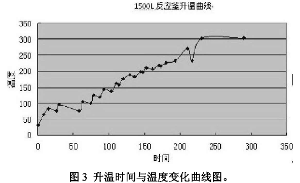 通電升溫,反應(yīng)釜內(nèi)由初始溫度升溫至350℃,然后恒溫lh,關(guān)閉電源,使其自然降溫,加熱恒溫總耗時(shí)為220min。具體升溫時(shí)間與溫度變化見圖3。