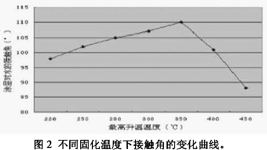 我們發(fā)現(xiàn)固化溫度影響涂層的表面性能。為優(yōu)化固化溫度,涂層在20一450℃不同溫度下固化,測試涂層的接觸角,見圖2。結(jié)果表明,涂層固化溫度在350℃時(shí),對水的接觸角達(dá)到較大值,為110“。圖2不同固化溫度下接觸角的變化曲線。